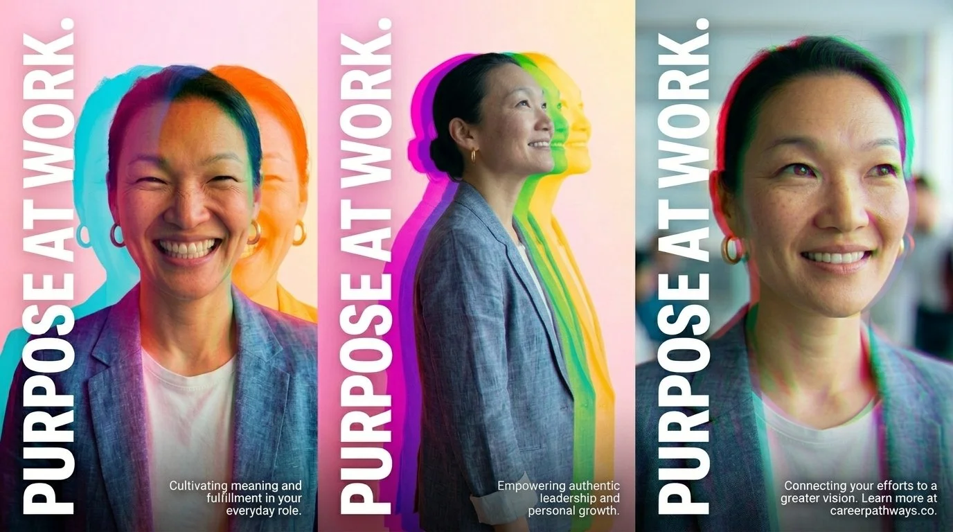 The AI Exploration: We utilized AI to experiment with multi-exposure and prismatic color shifts. By layering three distinct profiles of the same persona—each representing a different facet of the "Purpose at Work" narrative—we created a dynamic, energetic visual that feels alive. This approach allowed us to move away from static, single-subject photography toward a more symbolic and artistic representation of human impact.